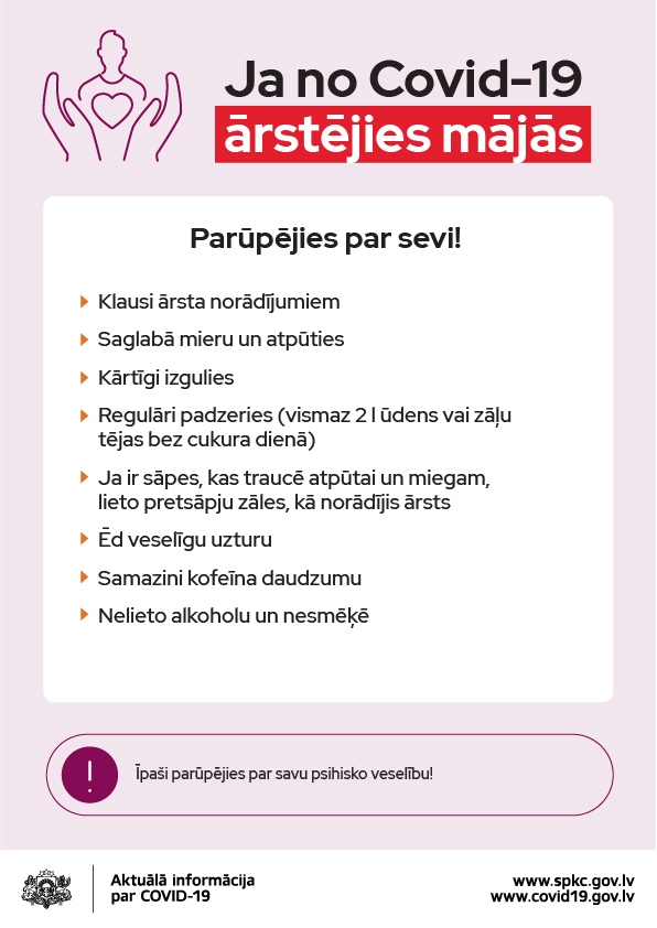 Paaugstinātas temperatūras gadījumā jālieto paracetamols vai ibuprofēnu saturoši līdzekļi. “Nevajag aizmirst piezvanīt savam ģimenes ārstam un pastāstīt par visām veselības stāvokļa izmaiņām. Protams, var gadīties, ka slimības laikā saasinās kāda cita kaite. Ja viņš nezvana un neinformē mūs, tad nekādi palīdzēt nevaram,” piekodina M. Ūburga, sakot, ka pat sākotnēji viegli slimības simptomi prasa tūlītēju reaģēšanu – ārstēšanās jāsāk ar pašu pirmo dienu.