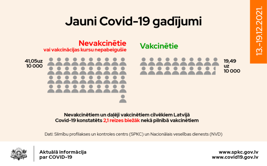 Salīdzinot infekcijas izplatības intensitāti uz 100 000 iedzīvotāju vakcinēto un nevakcinēto/daļēji vakcinēto cilvēku vidū pagājušajā nedēļā, nevakcinētiem un daļēji vakcinētiem cilvēkiem Latvijā Covid-19 infekcija konstatēta 2,1 reizes biežāk, nekā pilnībā vakcinētiem.