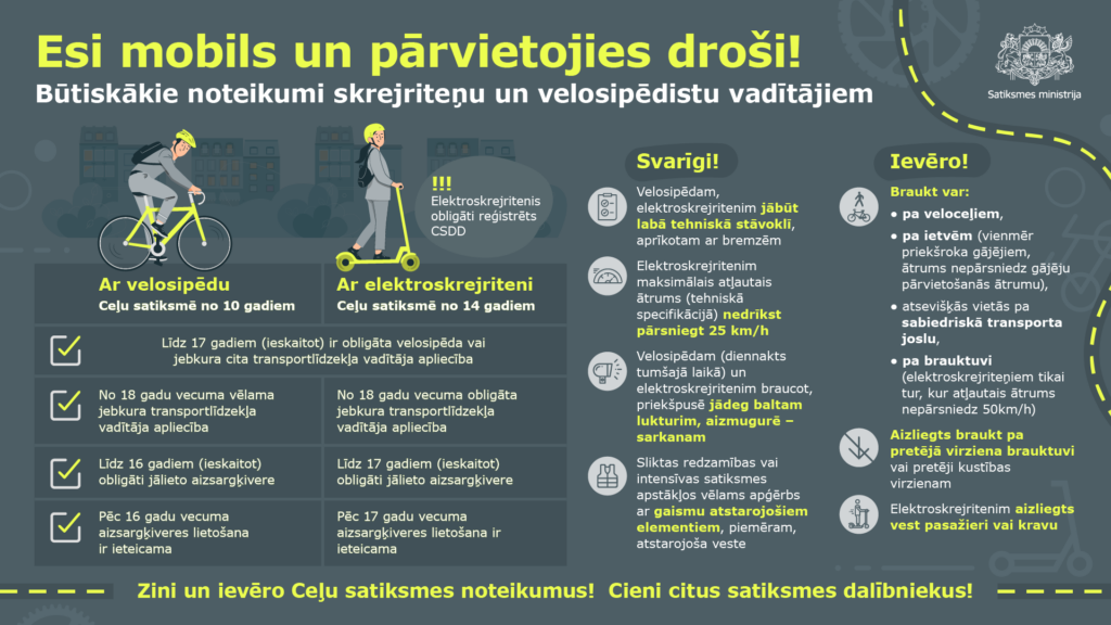 Iestājoties pavasarīgākiem laikapstākļiem, pilsētvidē pamazām atsākas elektroskrejriteņu sezona. Lai veicinātu iedzīvotāju ilgtspējīgu mobilitāti un vienlaikus uzlabotu ceļu satiksmes drošību, kā arī ņemot vērā ceļu satiksmes negadījumos gūtos traumu statistikas datus un mediķu ieteikumus, Ceļu satiksmes noteikumos (CSN) no šī gada ir noteiktas stingrākas prasības elektroskrejriteņu lietošanā.