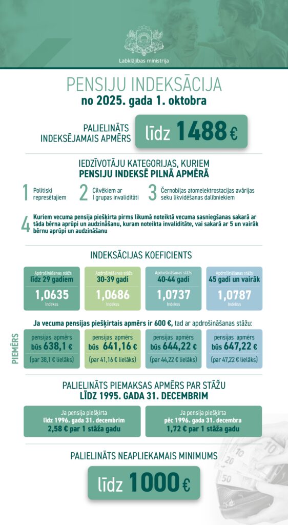 Atbilstoši likumam “Par valsts pensijām”, arī šogad 1. oktobrī notiks pensiju indeksācija. Pensiju indeksu veido faktiskais patēriņa cenu indekss (jeb inflācija) par 12 mēnešu laika posmu un daļa no apdrošināšanas iemaksu algu summas (kas ir summēta visa nauda, no kuras gada laikā bijis jāveic sociālās apdrošināšanas iemaksas) pozitīva reālā pieauguma procentiem.
