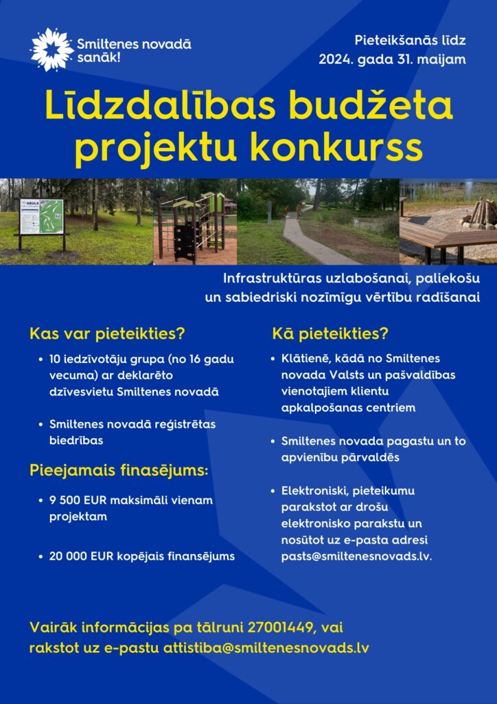 Konkursā projekta pieteikumus var iesniegt 10 iedzīvotāji, kuru dzīvesvieta ir deklarēta Smiltenes novadā un kuri sasnieguši vismaz 16 gadu vecumu vai Smiltenes novadā reģistrēta biedrība. Konkursa dalībnieki aicināti iesniegt idejas, kuras var īstenot sabiedrībai pieejamā publiskā vietā – Smiltenes novada pašvaldības vai, saņemot attiecīgu saskaņojumu, valsts nekustamā īpašumā. Projektam ir jābūt saistītam ar infrastruktūras uzlabošanu, kam ir paliekoša un sabiedriski nozīmīga vērtība, tā rezultāti ir pieejami plašam iedzīvotāju lokam. Projekta iesniedzējam pirms projekta iesniegšanas ir jāpiedalās konsultācijā ar Smiltenes novada pašvaldību par projekta realizāciju, lai precizētu projekta ieceres realizācijai nepieciešamās izmaksu pozīcijas. Konsultēties var ar Attīstības un plānošanas nodaļas speciālistiem pa tālr. 27001449.