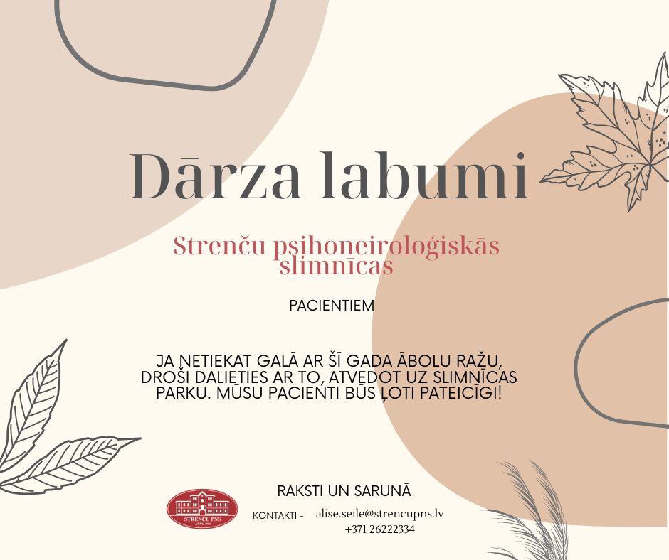 VSIA “Strenču psihoneiroloģiskā slimnīca’’ (turpmāk – Slimnīca) augustā un septembrī aicina iedzīvotājus dalīties un dāvināt slimnīcas pacientiem dažādus dārza labumus – augļus, ogas, kabačus un citus.