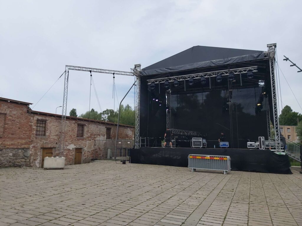 Jau trešdien Valgā, pie Ramsi dzirnavām, kur šo piektdien notiks Valkas un Valgas 440. jubilejas svinību pasākums “Balle bez robežām”, sāka būvēt lielo skatuvi. OTO: INGŪNA JOHANSONE