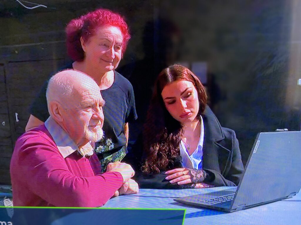 Valcēnieši Aldis un Līga Veinbergi kopā ar mazmeitu Lindu Strazdiņu informatīvo klipu, kurā piedalās Aldis kopā ar Lindu, aicinot piedalīties Eiropas Parlamenta vēlēšanās, noskatījās Valkā, savas mājas pagalmā. FOTO: INGA KARPOVA
