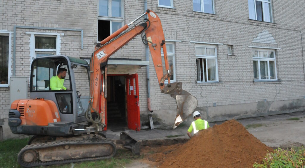 Šo trešdien, neskatoties uz lielo karstumu, no agra rīta līdz pat pulksten 22 vakarā uzņēmuma “Hydra Baltic” apakšnomnieki – vietējie darba izpildītāji – strādāja, lai dzīvojamo māju Rīgas ielā 30A pieslēgtu pie Valkas pilsētas kopējā kanalizācijas tīkla. Foto: Inga Karpova