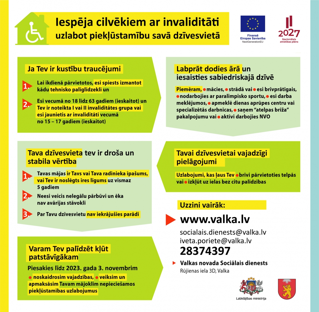 Eiropas Savienības Atveseļošanās un noturības mehānisma plāna pasākuma “Atbalsta pasākumi cilvēkiem ar invaliditāti mājokļa vides pieejamības nodrošināšanā” ietvaros paredzēts atbalsts personām ar invaliditāti, kurām ir kustību traucējumi, lai veiktu mājokļu pielāgojumus, kas uzlabos dzīves kvalitāti.