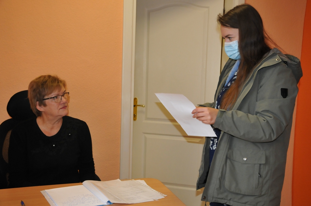 Valkas novada pašvaldības dzīvokļu komisijas ilggadējā sekretāre Līga Metuzāle skaidro Žanetei Burkēvicai, kā rīkoties, lai no pašvaldības saņemtu īres dzīvokli. Foto: Inga Karpova