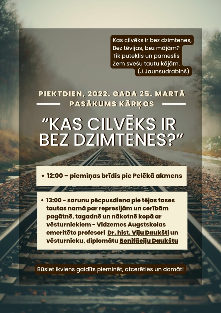 Piektdien, 25. martā Kārķos notiks pasākums “Kas cilvēks ir bez dzimtenes?”, kas veltīts tiem, kuriem liktenis bija lēmis iet smago Golgāta ceļu. Pulksten 12.00 būs piemiņas brīdis pie Pelēkā akmens. Pēc tam pulksten 13.00 tautas namā tikšanās un saruna pie tējas tases kopā ar vēsturniekiem Viju un Bonifāciju Daukštiem.