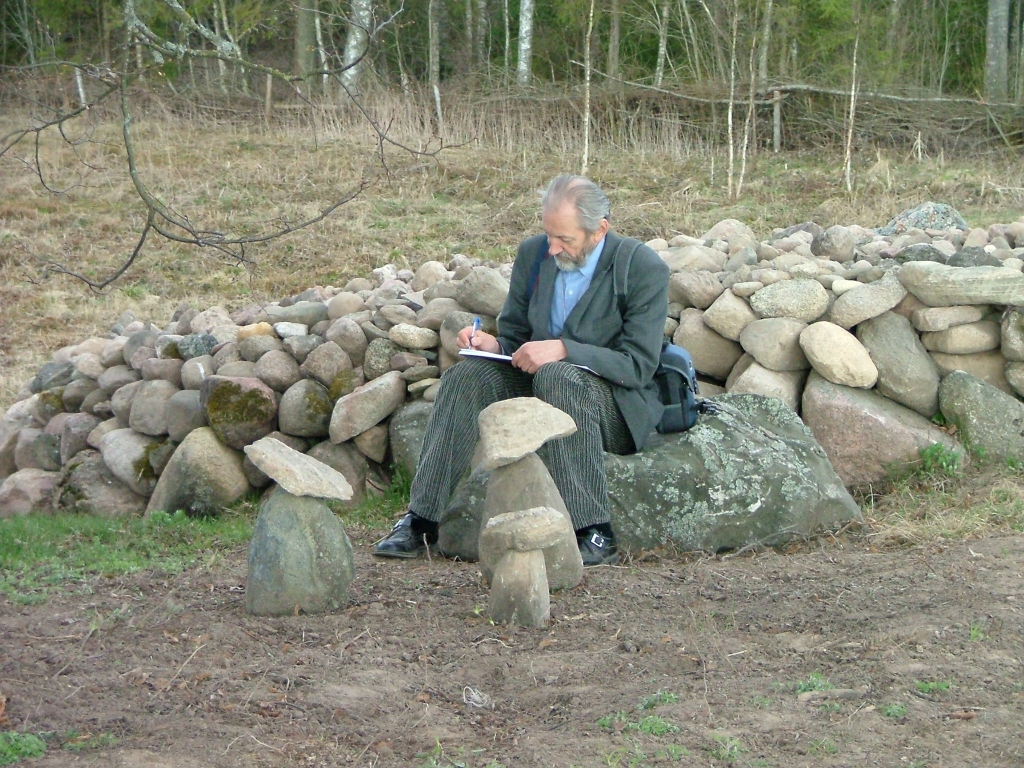 Latvijā pazīstamais dabas pētnieks Guntis Eniņš pirmais atklāja Strautmaļu dižliepu. Sēžot uz akmeņu krāvuma piliena formā, pētnieks kokam raksta īpašo novēlējumu. Foto: Sandra Pilskalne