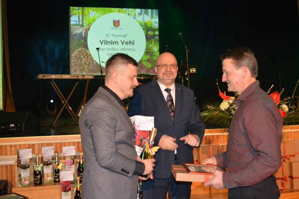 Zemnieku saimniecības “Purmaļi” saimnieks Vilnis Vehi šogad “Lauku ballē” godināts ar Pateicību par izcilību dārzeņu audzēšanā. Attēlā Ērģemes un Kārķu pagastu pārvalžu vadītājs Pēteris Pētersons (no kreisās), Valkas novada pašvaldības priekšsēdētājs Vents Armands Krauklis un Vilnis Vehi. Foto: Ilze Fedotova