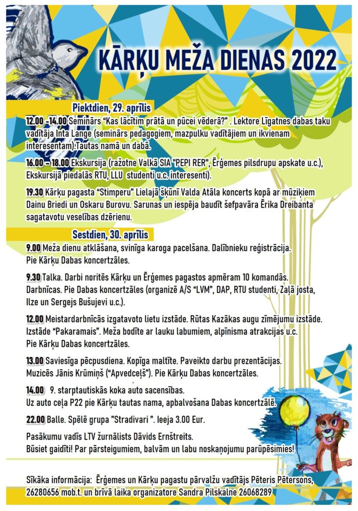 Pasākuma otrā dienā – sestdien, 30. aprīlī plānots, ka pulksten 9.00 pasākuma atklāšana, dalībnieku reģistrācija. Darbi noritēs apmēram 10 komandās Kārķu un Ērģemes pagastos. Jau no pulksten 10.00 pie Dabas koncertzāles darbu uzsāks ļoti interesantas Latvijas Valsts mežu speciālistu, Dabas aizsardzības pārvaldes, Rīgas Tehniskās universitātes studentu, SIA “Zaļā josta”, Ilzes un Sergeja Bušujevu u.c. radošas un atraktīvas darbnīcas bērniem un pieaugušajiem. Kā vienmēr būs arī Meža bodīte ar lauku labumiem, aizraujošas alpīnisma atrakcijas un vēl vairākas citas aktivitātes. Pulksten 13.00 saviesīga pēcpusdiena, kurā visiem būs gardas vietējo saimnieču sarūpētas pusdienas, kas tiks baudītas klausoties grupas “Apvedceļš” mūziķa Jāņa Krūmiņa priekšnesumus. Pulksten 14.00 Koka auto sacensības. Labā ziņa ir tā, ka vēl var paspēt izgatavot koka auto (nolikums Valkas novada mājas lapā un Kārķu facebook lapā)! Tālāk aizbraukušo auto īpašniekiem balvā ar EP deputātes Sandras Kalnietes atbalstu sarūpēts brauciens uz Briseli, arī visu četru grupu pirmo trīs vietu ieguvējiem vērtīgas balvas! Pēc apbalvošanas laimīgo ciparu izloze un vēl vairākas citas aktivitātes. Pulksten 22.00 tautas namā balle. Spēlēs grupa “Stradivari”. Pasākumu vadīs LTV žurnālists Dāvids Ernštreits.