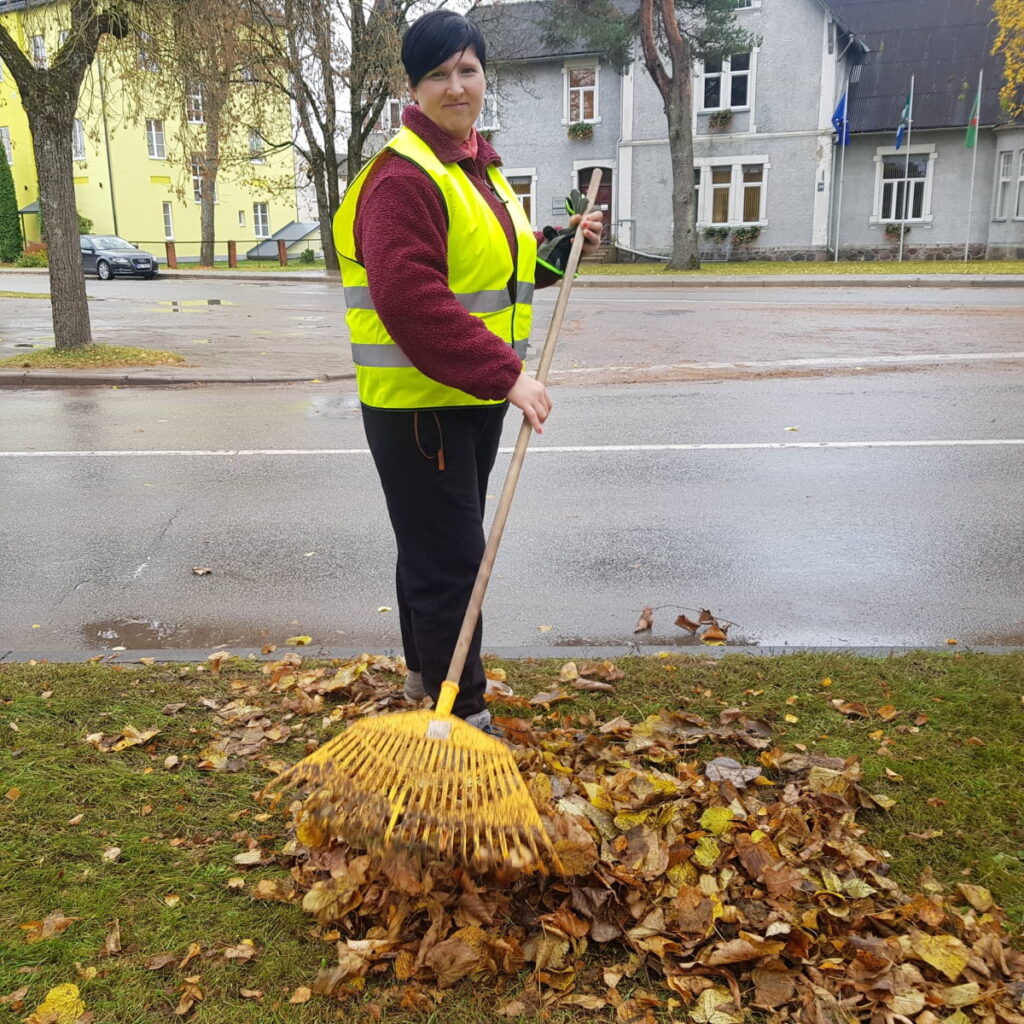“Man patīk grābt lapas. Man tas padodas. Šoruden ir daudz lapu. Tas nekas, ka līņā, jo es priecājos, ka varu strādāt un nopelnīt naudu,” ar prieku stāsta novada pašvaldības Pilsētas teritorijas apsaimniekošanas nodaļas pagaidu sabiedriskajos darbos nodarbinātā Līga Muraško. Viņa kopā ar vīru dzīvo grupu dzīvokļu mājā Tālavas ielā 33.