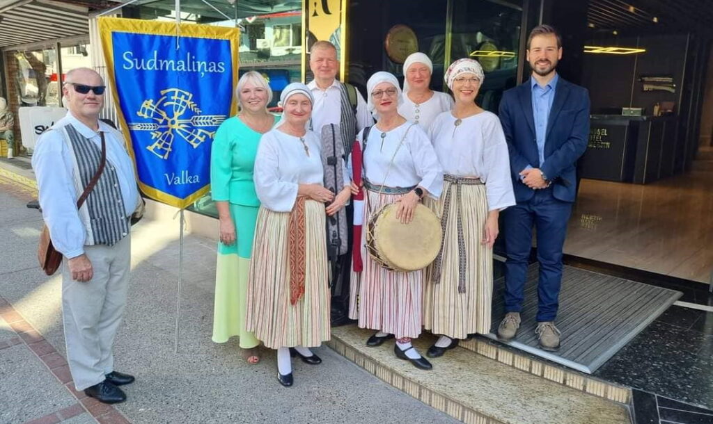 Latviju kultūras festivālā Mersinā, Turcijā, pārstāvēja Valkas pilsētas kultūras nama tautas mūzikas kapelas “Sudmaliņas” dalībnieks Rolands Rastaks (attēlā no kreisās), Līga Veinberga, Unda Ozoliņa, Inguna Medne, delegācijas vadītāja Ilze Grandava (otrajā rindā pirmā no kreisās), kapelas dalībnieks Jānis Kaukulis un Tija Bērtiņa. Foto: No personīgā arhīva