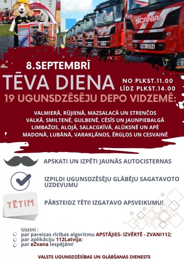 Par to padomājusi arī Valsts ugunsdzēsības un glābšanas dienesta (VUGD) Vidzemes reģiona pārvalde, aicinot ikvienu Tēva dienā – svētdien, 8. septembrī, – no pulksten 11 līdz 14 apciemot kādu no 19 ugunsdzēsības depo Vidzemē, tai skaitā Smiltenē un Valkā. “Tā būs iespēja aplūkot un iepazīt šogad iegādāto specializēto transportu, noskaidrot visu, kas jautājams par ugunsdrošību mājās, ceļā vai skolā, kā arī izpildīt ugunsdzēsēju glābēju sagatavoto uzdevumu. Mazākie apmeklētāji varēs izkrāsot apsveikumu un ierakstīt kādu jauku novēlējumu tētim, krusttēvam vai opim. Varēs uzzināt par jauno 112 Latvija aplikāciju, eZvana iespējām un kā atkārtot pareizas rīcības algoritmu, ja izcēlies ugunsgrēks vai ieraudzīta degoša automašīna,” informē Sandra Vējiņa, VUGD Prevencijas un sabiedrības informēšanas nodaļas vecākā inspektore Vidzemes reģionā.