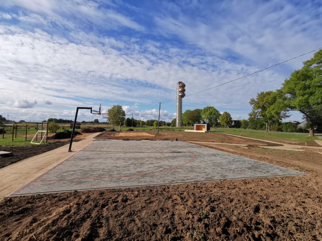 Būvniecības darbus veic SIA “MJ Eirobūve”, projekta ietvaros jau uzstādīta nojume ar platformu un izbūvēti gājēju celiņi (kopējais garums 240m), celiņi ir no grants seguma. Teritorijā vēl paredzēts uzstādīt 5 apgaismes ķermeņus ar saules baterijām, lai izgaismotu atpūtas vietu dienas tumšajā laikā.