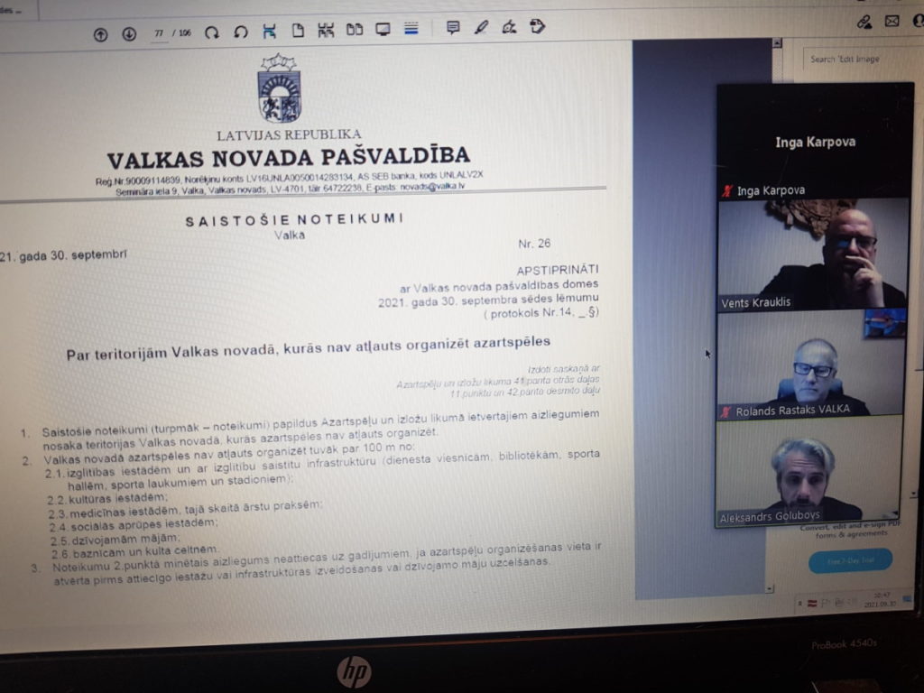 Ceturtdien, 30.septembrī, attālināti notikušajā Valkas novada domes sēdē pašvaldības deputāti vienbalsīgi un bez diskusijām pieņēma lēmumu par Saistošajiem noteikumiem, kas nosaka teritorijas, kurās nevarēs organizēt azartspēles, tostarp arī atvērt spēļu zāles.