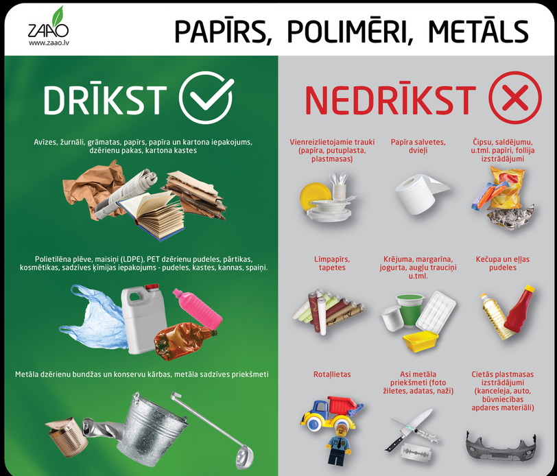 Konteinerā VIEGLAJAM IEPAKOJUMA DRĪKST IEVIETOT papīru, kartonu, PET dzērienu pudeles, polietilēna plēves (LDPE), kosmētikas un sadzīves ķīmijas iepakojumu (HDPE) – kastes, kannas, pudeles, spaiņus, kā arī metāla priekšmetus. Iepakojumam, kas tiek ievietots konteineros, ir jābūt izskalotam un saplacinātam.