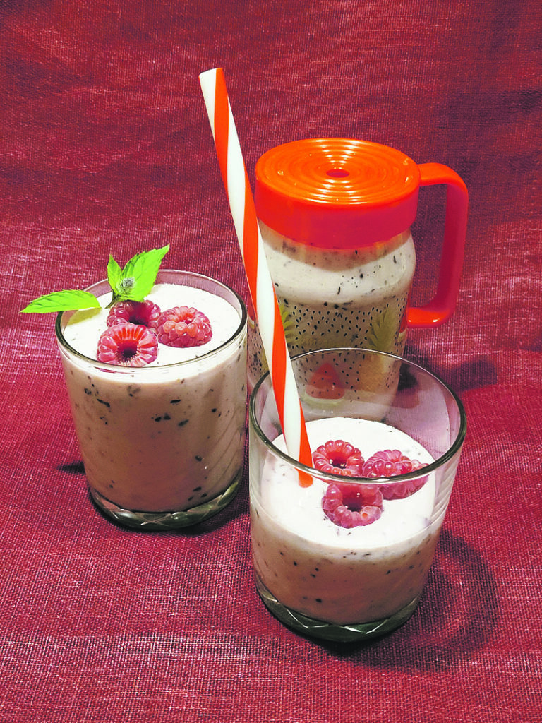 VIETĒJĀS OGAS – lielās mellenes un avenes – izmantoju arī, lai pamielotos ar lielisku kokteili. Blendera krūzē liku gabaliņos salauzītu aveņu zefīru, pievienoju noskalotas un apsusinātas mellenes un avenes un pielēju kefīru. Ar mietveida mikseri visu sasmalcināju viendabīgā kokteilī. To lēju glāzēs un greznoju ar ogām un piparmētru lapiņām. Šāds deserts atsvaidzina karstākā dienā un sniedz saldu baudījumu.
