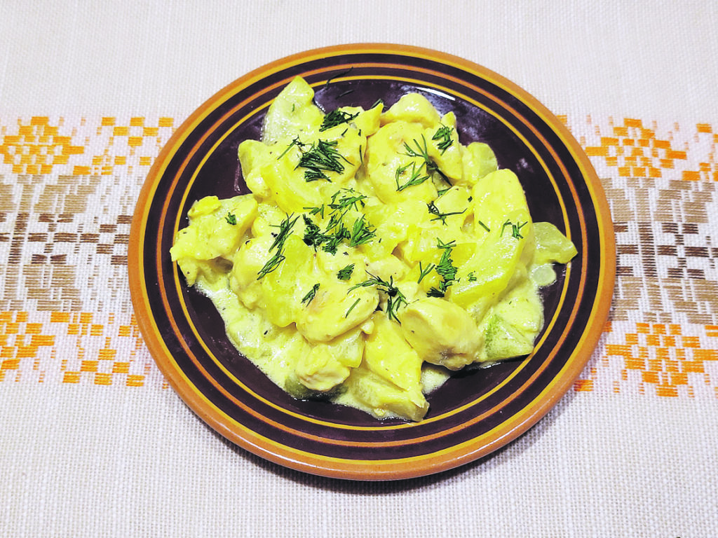 Pannā uz vidējas uguns uzkarsēju augu eļļu un vispirms tajā līdz caurspīdīgumam apcepu sīpolus. Tad pievienoju cāļa fileju gabaliņus un cepu lielākā karstumā, līdz iztvaikojis liekais šķidrums, vismaz piecas minūtes. Pēc tam piekaisīju sāli, piparus un citas garšvielas un apmaisot cepu vēl minūtes piecas. Nu pieliku kabačus un samaisīju, uzliku pannai vāku un uz nelielas uguns sautēju apmēram desmit minūtes, līdz gaļa un kabači kļuva mīksti. Vēl tikai pievienoju skābo krējumu – derēs gan treknāks, gan liesāks – un visu kopā apmaisot pasautēju 2 – 3 minūtes. Gatavo ēdienu pārkaisīju ar sasmalcinātiem diļļu zaļumiem un varēju celt galdā.