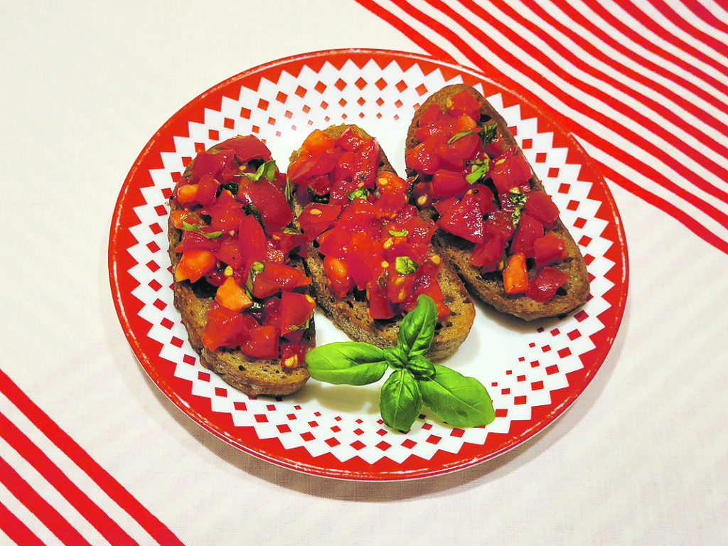 Tomātu nomazgāju, apsusināju un ar asu nazi sagriezu mazos kubiciņos. Pievienoju smalki saplucinātas svaiga bazilika lapiņas, nedaudz olīveļļas, sāli un piparus pēc garšas. Visu samaisīju un izliku uz apceptajām maizes šķēlītēm. Rotājumam – bazilika lapiņas.