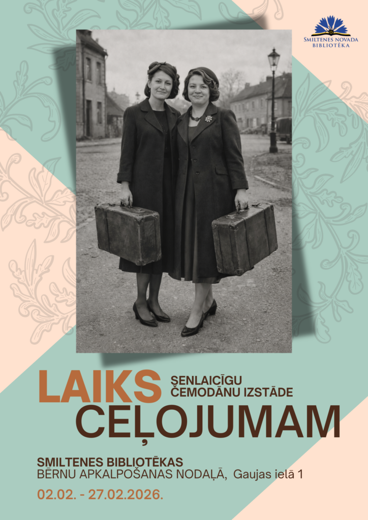 Smiltenes bibliotēkas Bērnu apkalpošanas nodaļa aicina apmeklēt izstādi “Laiks ceļojumam”, kurā apskatāmi autentiski čemodāni no 20. gadsimta vidus – aptuveni 1955.–1965. gada perioda.