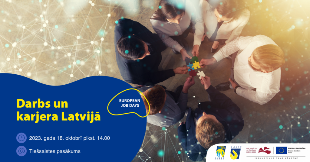 2023. gada 18. oktobrī no plkst. 14.00 līdz 16.00 Eiropas darba dienu platformā (www.europeanjobdays.eu) norisināsies Nodarbinātības valsts aģentūras (NVA) un Eiropas nodarbinātības dienestu tīkla (EURES) rīkotā tiešsaistes darba diena „Darbs un karjera Latvijā”. Pasākuma laikā ar Latvijas darba devējiem tiešsaistē varēs satikties darba meklētāji, kuri dzīvo gan Latvijā, gan citviet pasaulē. Tiešsaistes darba diena „Darbs un karjera Latvijā” ir lieliska iespēja darba devējiem piesaistīt darbam savos uzņēmumos arī tos Latvijas valstspiederīgos speciālistus, kuri šobrīd dzīvo un strādā ārvalstīs, bet vēlas atgriezties Latvijā. Gan darba devējiem, gan darba meklētājiem dalība pasākumā ir BEZ MAKSAS!