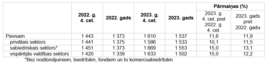 2023. gada 4. ceturksnī, salīdzinot ar 2022. gada 4. ceturksni, straujāk vidējā darba samaksa auga sabiedriskajā un vispārējās valdības sektorā – par 15,0 %, bet privātajā sektorā pieaugums bija 10,1 %.