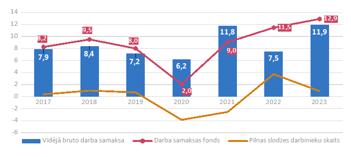 Darba samaksas fonds 2023. gadā salīdzinājumā ar 2022. gadu valstī kopumā pieauga par 12,9 % jeb 1 571,2 milj. eiro, savukārt algoto darbinieku skaits, pārrēķināts pilnā slodzē – par 6,8 tūkst. jeb 0,9 %.