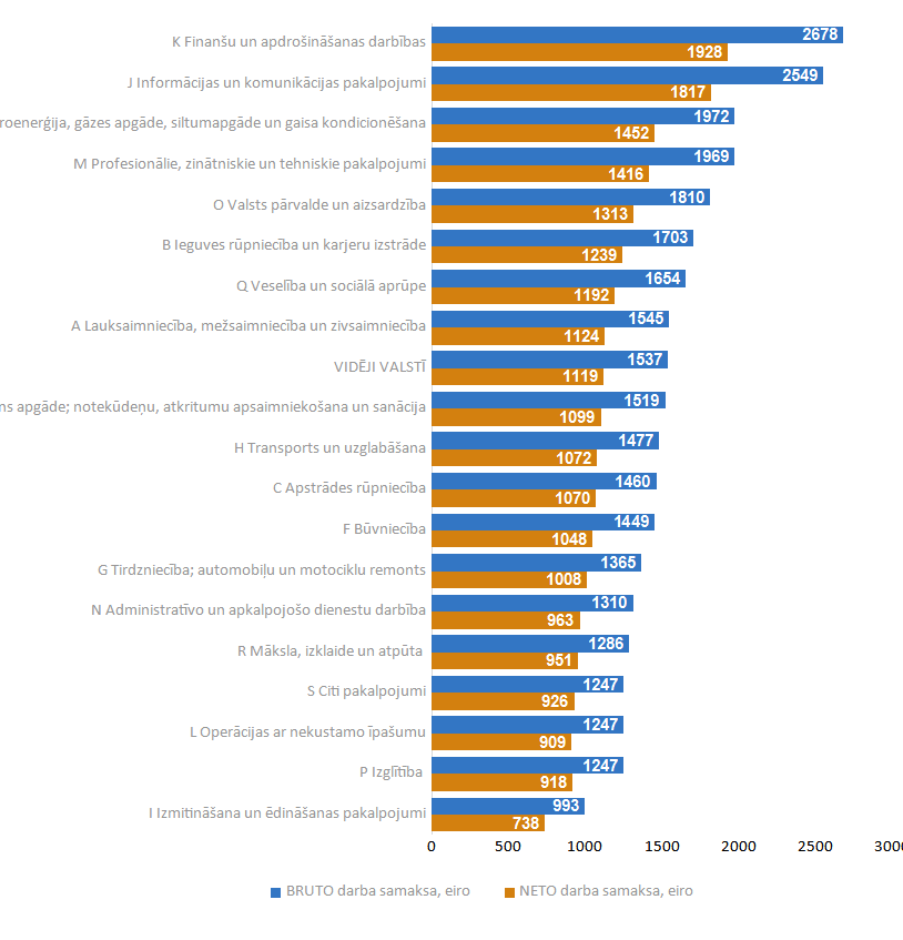 2023. gadā vidējā darba samaksa mēnesī lielāka par vidējo valstī bija finanšu un apdrošināšanas darbību nozarē, informācijas un komunikācijas pakalpojumu, enerģētikas, profesionālo, zinātnisko un tehnisko pakalpojumu, valsts pārvaldes un aizsardzības, ieguves rūpniecības un karjeru izstrādes nozarē, veselības un sociālās aprūpes, kā arī lauksaimniecības, mežsaimniecības un zivsaimniecības nozarē.
