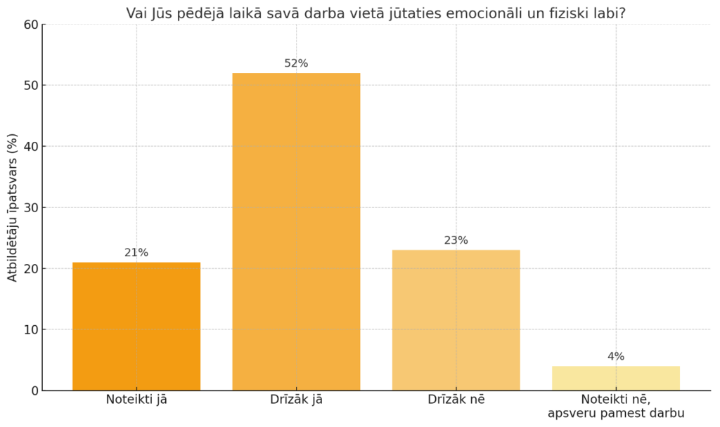 Aptaujas dati rāda, ka 52 % strādājošo savā darba vietā jūtas drīzāk labi, domājot par savu emocionālo un fizisko labsajūtu, savukārt 30 % norāda, ka pašreizējā darbavietā nejūtas apmierināti, no tiem teju 5 % apsver iespēju šo iemeslu dēļ pamest darbu.