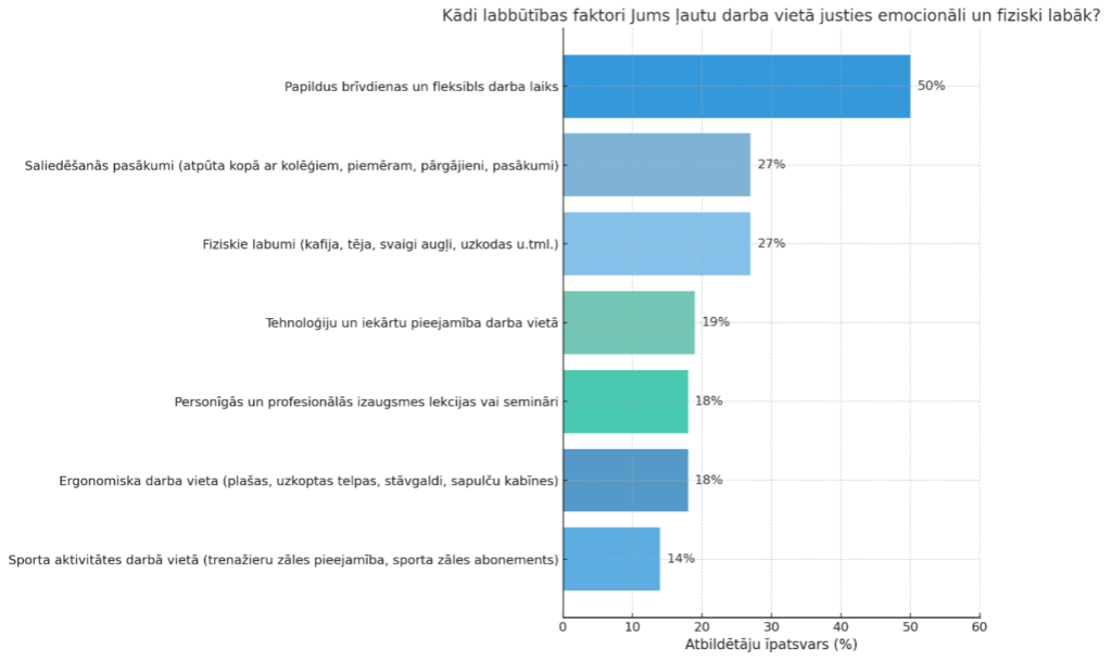 Uzskaitot vēl faktorus, kas veicinātu emocionālo un fizisko labsajūtu darba vietā, tika izcelta tehnoloģiju un iekārtu pieejamība (19 %), personīgās vai profesionālās izaugsmes lekcijas vai semināri (18 %), ergonomiskas darba vides nozīme, kas iekļauj plašas, uzkoptas telpas, stāvgaldus, sapulču kabīnes (18 %), sporta aktivitātes, tostarp trenažieru zāles pieejamība vai sporta zāles abonements (14 %).
