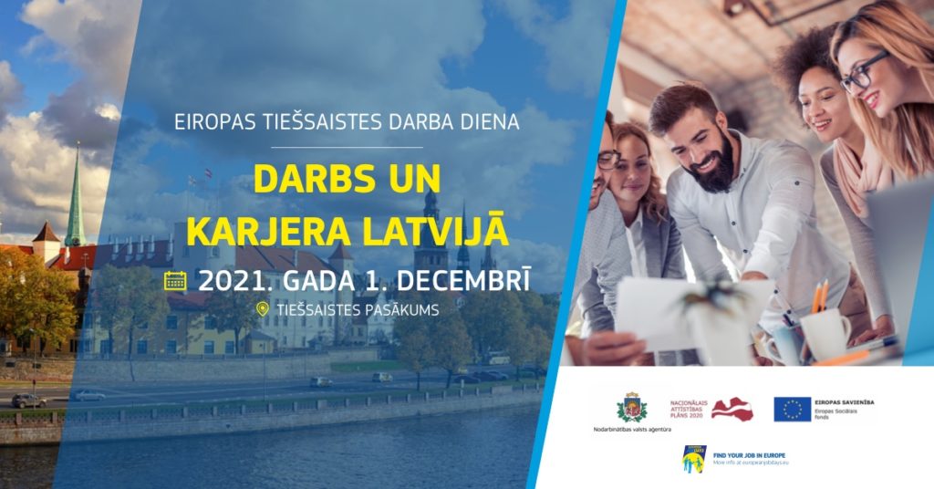 Aicinām darba devējus un darba meklētājus reģistrēties dalībai Nodarbinātības valsts aģentūras (NVA) un Eiropas nodarbinātības dienestu tīkla EURES rīkotajā tiešsaistes (online) darba dienā „Darbs un karjera Latvijā”, kas norisināsies šī gada 1. decembrī no plkst. 14.00 līdz 16.00 Eiropas darba dienu platformāDalība pasākumā ir bez maksas!