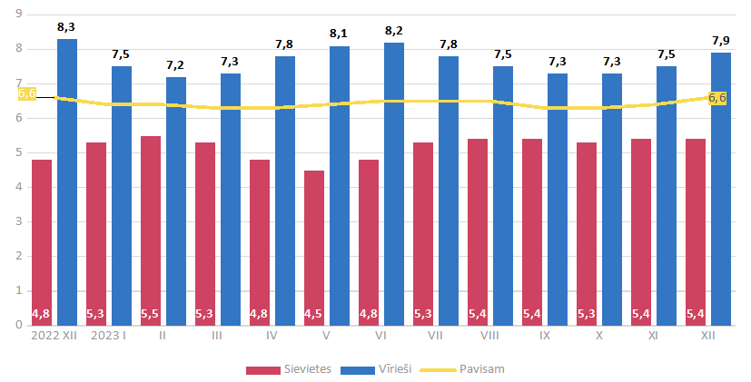 Sieviešu bezdarba līmenis decembrī saglabājās nemainīgs – 5,4 %, taču vīriešu pieauga par 0,4 procentpunktiem līdz 7,9 %.