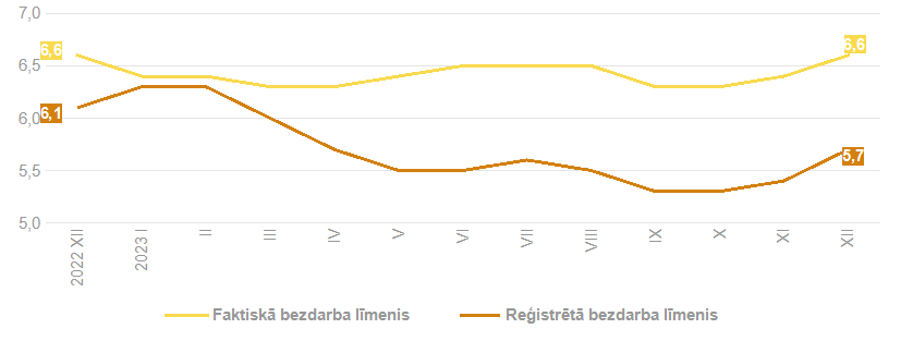 Nodarbinātības valsts aģentūrā (NVA) reģistrētā bezdarba līmenis bija 5,7 %, un kopš novembra tas ir palielinājies par 0,3 procentpunktiem. Salīdzinot ar 2022. gada decembri, reģistrētā bezdarba līmenis ir samazinājies par 0,4 procentpunktiem.