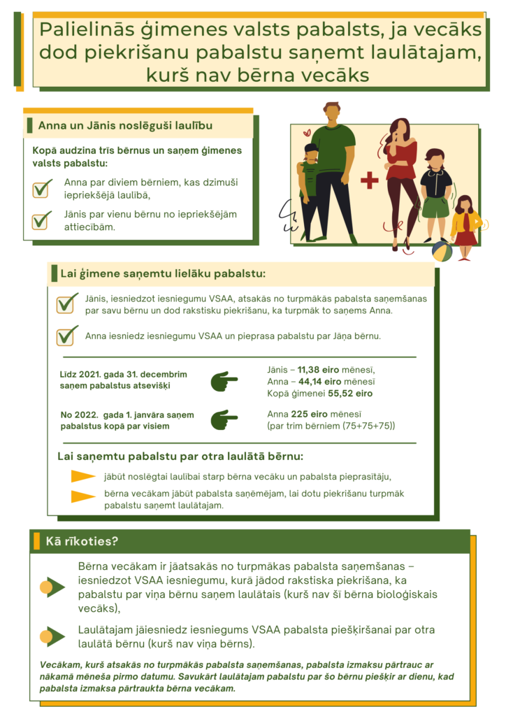 Lai šo iespēju izmantotu, laulātajam, kurš saņem ģimenes valsts pabalstu par savu bērnu, jāiesniedz iesniegums Valsts sociālās apdrošināšanas aģentūrai (VSAA) par labprātīgu atteikšanos no viņam piešķirtā pabalsta turpmākās saņemšanas, piekrītot, ka pabalstu turpmāk saņems otrs laulātais. Savukārt, laulātajam, kurš nav bērna vecāks, jāiesniedz iesniegums pabalsta piešķiršanai par šo bērnu. Svarīgs nosacījums – laulības fakts! Ja pāris dzīvo kopā nereģistrētā laulībā un audzina bērnus, kas nav abu kopīgie bērni, tad vienam no viņiem saņemt pabalstus par visiem bērniem tiesību nav.