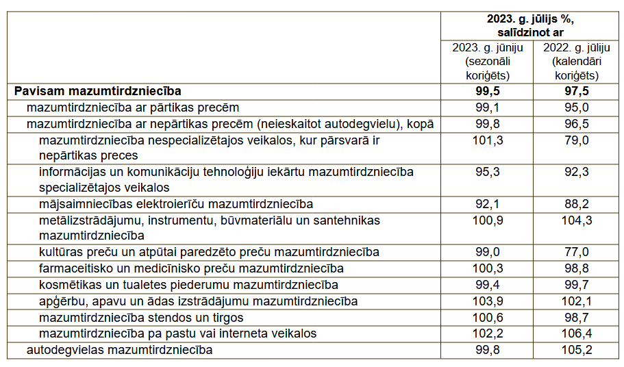 2023. gada jūlijā, salīdzinot ar jūniju, pēc sezonāli koriģētiem datiem salīdzināmajās cenās mazumtirdzniecības uzņēmumu apgrozījums samazinājās par 0,5 %. Pārtikas preču mazumtirdzniecība samazinājās par 0,9 %. Nepārtikas preču mazumtirdzniecības apjoms, neieskaitot autodegvielas mazumtirdzniecību, samazinājās par 0,2 %, autodegvielas mazumtirdzniecība samazinājās par 0,2 %.