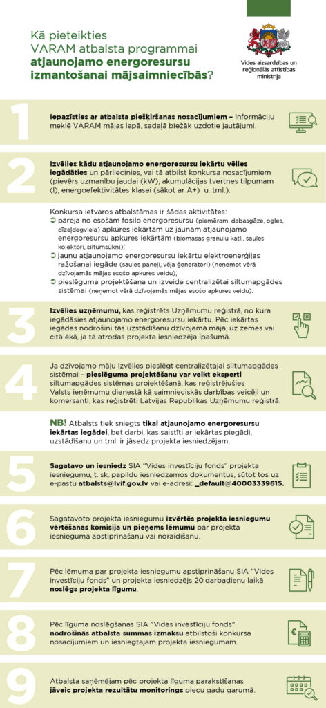 Vides aizsardzības un reģionālās attīstības ministrijas (VARAM) izveidotajai atbalsta programmai atjaunojamo energoresursu izmantošanai mājsaimniecībās un mājsaimniecību pieslēguma centralizētajai siltumapgādes sistēmai projektēšanai un siltummezgla izveidei jau kopš 15. marta var iesniegt projektu iesniegumus  SIA “Vides investīciju fonds”.  Lai atbalstu izmantotu pēc iespējas efektīvāk, VARAM ir sagatavojusi īsu soļu aprakstu, kas veicami, lai atbalstu saņemtu.