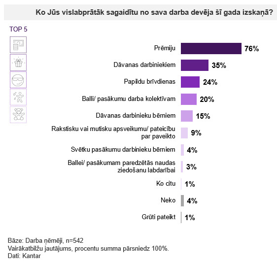 Pētījumu kompānija Kantar veica aptauju ar mērķi noskaidrot, ko darba ņēmēji Latvijā vislabprātāk sagaidītu no sava darba devēja šī gada izskaņā. Pētījuma rezultāti atklāj, ka vairākums jeb trīs no četriem (76%) darba ņēmējiem Latvijā no sava darba devēja šī gada izskaņā vislabprātāk sagaidītu prēmiju.