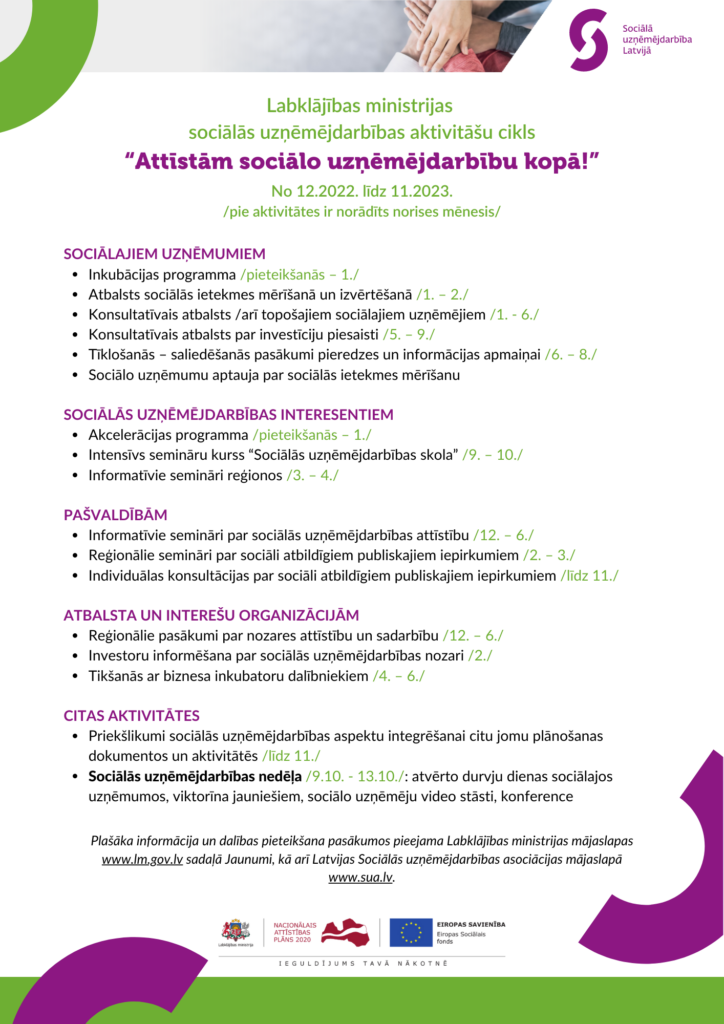 Plašāka informācija un dalības pieteikšana visos aktivitāšu cikla pasākumos būs pieejama Labklājības ministrijas mājaslapas www.lm.gov.lv sadaļā “Jaunumi”, kā arī Latvijas Sociālās uzņēmējdarbības asociācijas Facebook kontā un mājas lapā www.sua.lv.