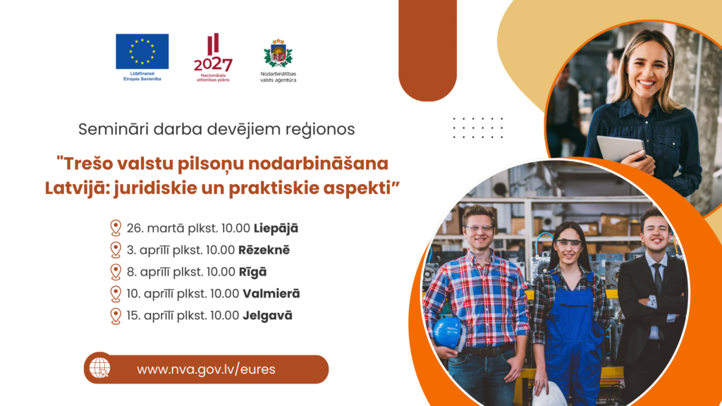 Šopavasar, no 26. marta līdz 15. aprīlim,Nodarbinātības valsts aģentūra (NVA) Liepājā, Rēzeknē, Rīgā, Valmierā un Jelgavā rīko reģionālos seminārus darba devējiem “Trešo valstu pilsoņu nodarbināšana Latvijā: juridiskie un praktiskie aspekti”. Uzņēmēji tiks informēti par ārvalstu darbaspēka piesaistes nosacījumiem, normatīvajiem regulējumiem un risinājumiem, kā arī uz darba devēju jautājumiem atbildēs eksperti – NVA, Pilsonības un migrācijas lietu pārvaldes (PMLP), Valsts darba inspekcijas (VDI) un Eiropas nodarbinātības dienestu tīkla (EURES) pārstāvji. Semināri tiek rīkoti Eiropas Sociālā fonda (ESF) Plus projekta “EURES tīkla darbības nodrošināšana Latvijā” ietvaros. Darba devēju dalība pasākumos ir bez maksas.