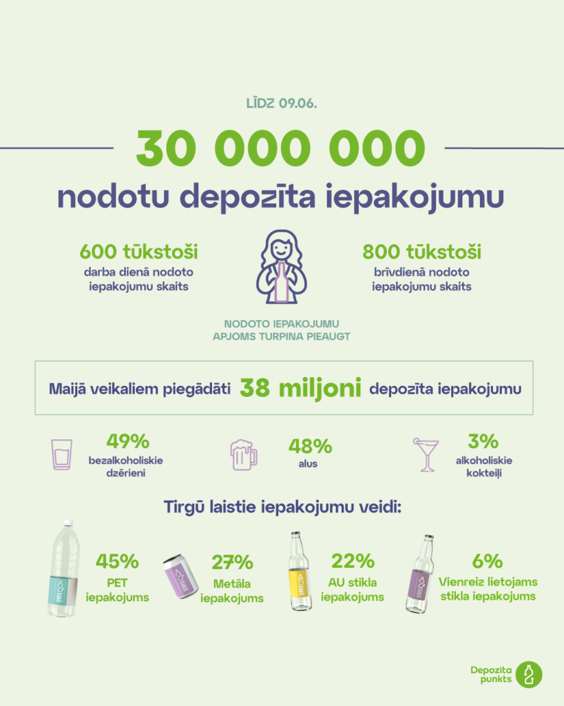 No 1. februāra līdz 8. jūnijam (ieskaitot) depozīta sistēmā nodoti 30 miljoni iepakojuma vienību, turklāt aktuālie dati liecina, ka šobrīd darba dienās tiek nodoti ap 600 tūkstošiem depozīta iepakojumu, savukārt nedēļas nogalēs ap 800 tūkstošiem iepakojumu dienā, un nodoto iepakojumu apjoms turpina pieaugt. Vienā iepakojumu nodošanas reizē iedzīvotāji atgriež vidēji 14 depozīta vienības, savukārt vidējais laiks, kas paiet no iepakojuma iegādes brīža līdz tā nodošanai depozīta punktā, svārstās no 4 līdz 6 nedēļām.