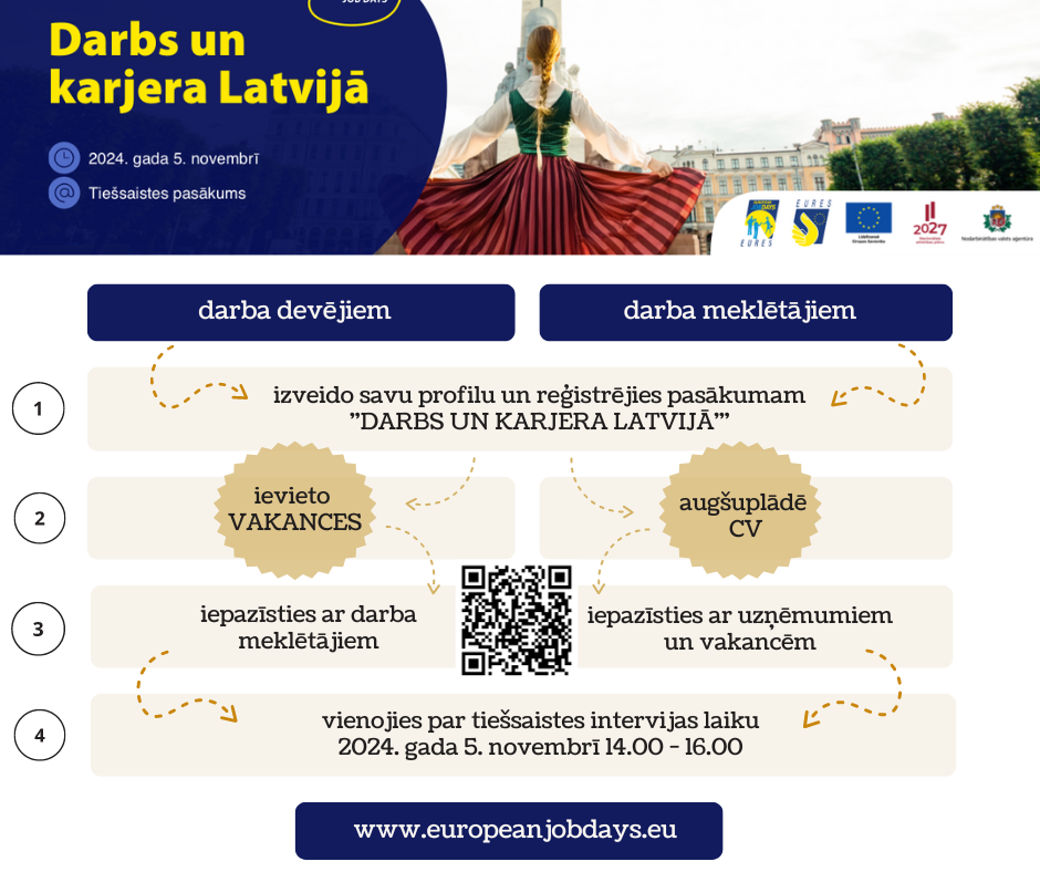 Aicina darba devējus un darba meklētājus reģistrēties dalībai Nodarbinātības valsts aģentūras (NVA) un Eiropas nodarbinātības dienestu tīkla EURES rīkotajā tiešsaistes darba dienā „Darbs un karjera Latvijā”, kas 5. novembrī no plkst. 14.00 līdz 16.00 norisināsies Eiropas darba dienu platformā (www.europeanjobdays.eu). Darba devējiem tā ir lieliska iespēja atrast uzņēmumam vajadzīgos speciālistus un popularizēt savu biznesu, veicinot tā starptautisku atpazīstamību, bet darba meklētājiem tā ir iespēja atrast piemērotu darbu Latvijā. Dalība pasākumā ir bez maksas! Tiešsaistes darba diena tiek rīkota Eiropas Sociālā fonda (ESF) Plus projekta “EURES tīkla darbības nodrošināšana Latvijā” ietvaros.
