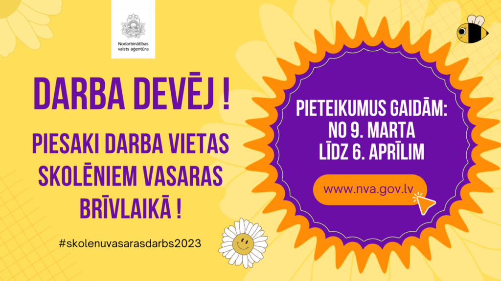 Nodarbinātības valsts aģentūras (NVA) filiāles visā Latvijā no 9. marta līdz 6. aprīlim pieņem darba devēju pieteikumus skolēnu nodarbinātības pasākuma īstenošanai 2023. gada vasarā.