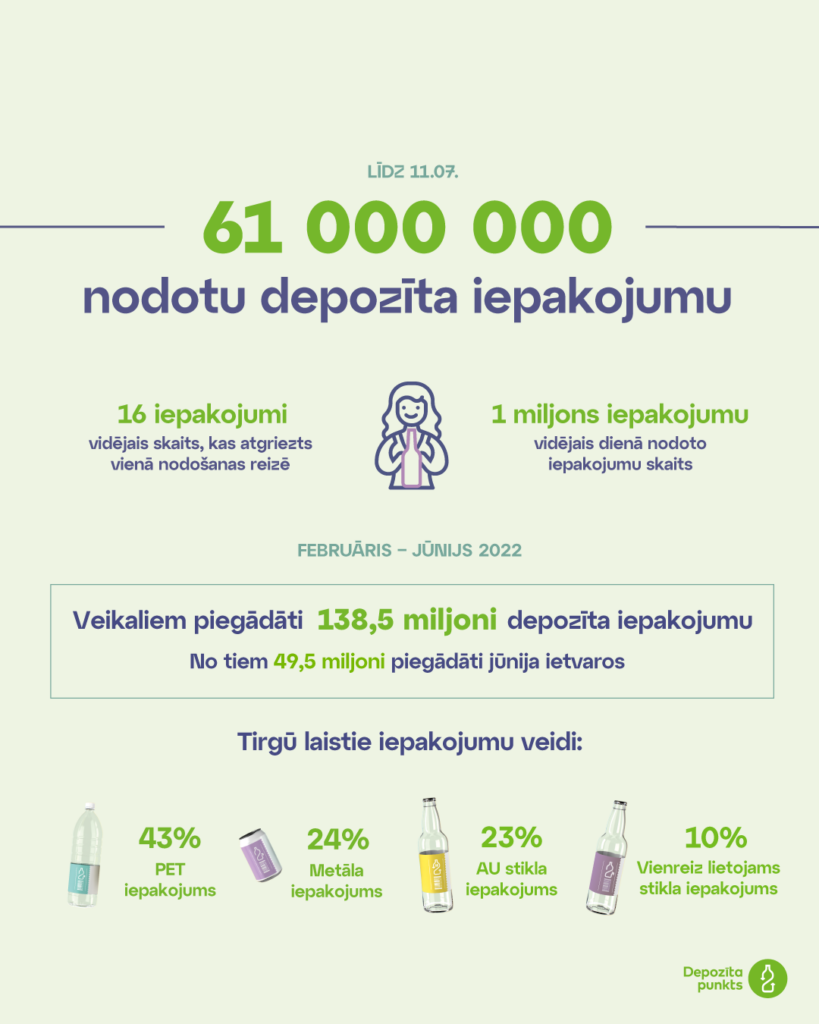 No 1. februāra līdz 11. jūlijam (ieskaitot) depozīta sistēmā nodots vairāk nekā 61 miljons iepakojuma vienību, un aktuālie dati liecina, ka šobrīd vidēji ik dienu tiek nodots vairāk nekā 1 miljons tukšo iepakojumu, turklāt paredzams, ka šāds apjoms saglabāsies visas vasaras sezonas garumā. Vienā iepakojumu nodošanas reizē iedzīvotāji patlaban atgriež vidēji 16 depozīta vienības, savukārt vidējais laiks, kas paiet no iepakojuma iegādes brīža līdz tā nodošanai depozīta punktā, svārstās no 4 līdz 6 nedēļām.
