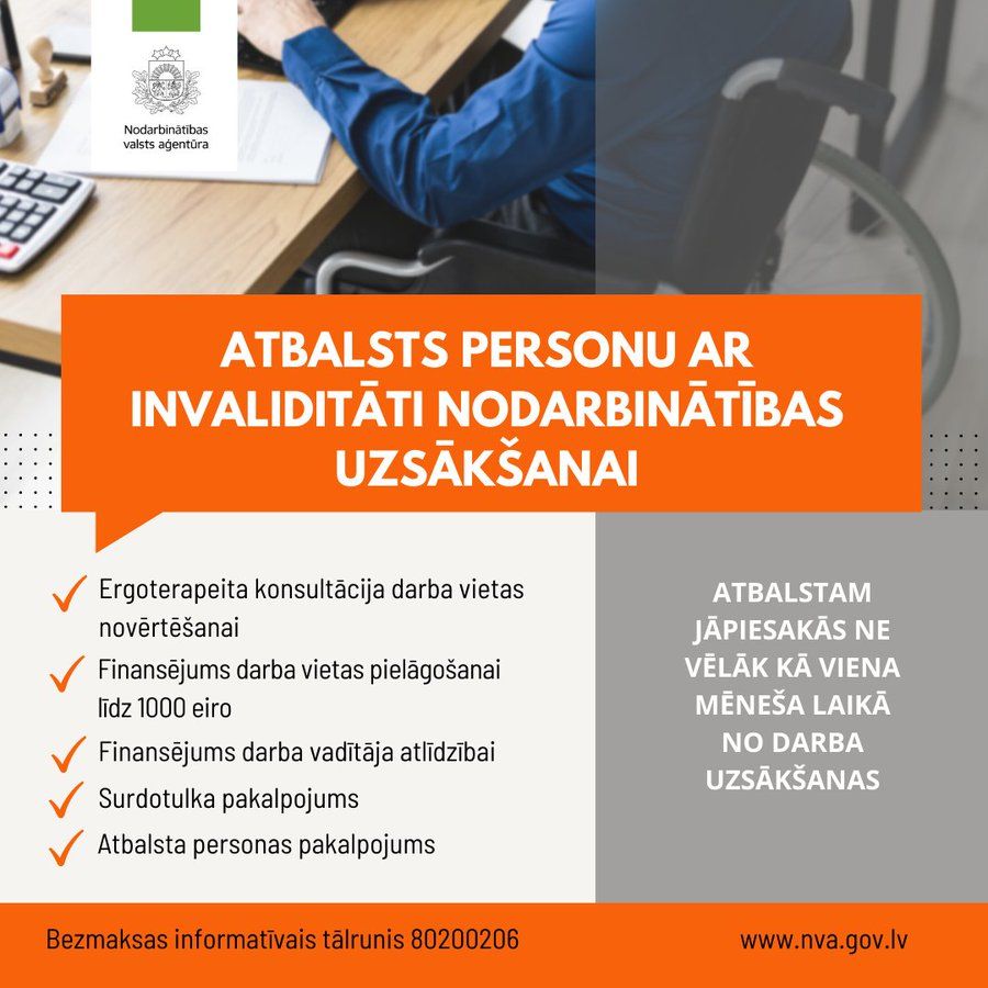 Darba devējiem, kuri bezdarbniekus ar invaliditāti nodarbina uz nenoteiktu laiku, darba tiesisko attiecību sākumposmā Nodarbinātības valsts aģentūra (NVA) piedāvā atbalstu – ergoterapeita konsultāciju, dotāciju darba vietas aprīkošanai un dotāciju darba vadītājam.