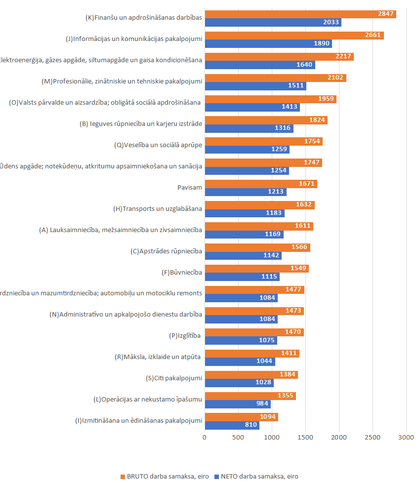 2024. gada 2. ceturksnī vidējā darba samaksa mēnesī par pilnas slodzes darbu lielāka par vidējo valstī bija finanšu un apdrošināšanas darbību (2 847 eiro), informācijas un komunikācijas pakalpojumu (2 661 eiro), enerģētikas (2 217 eiro), profesionālo, zinātnisko un tehnisko pakalpojumu nozarē (2 102 eiro), valsts pārvaldes (1 959 eiro), ieguves rūpniecības un karjeru izstrādes (1 824 eiro) nozarē, veselības un sociālās aprūpes (1 754 eiro), kā arī ūdens apgādes, notekūdeņu, atkritumu apsaimniekošanas un sanācijas nozarē (1 747 eiro).