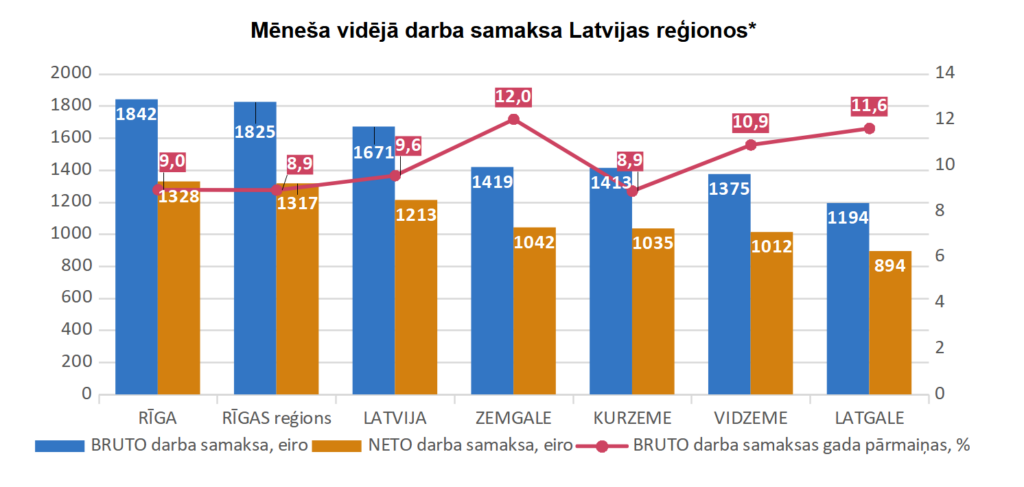 Vislielākā vidējā bruto darba samaksa par pilnas slodzes darbu bija Rīgā – 1 842 eiro, savukārt viszemākā – Latgalē (1 194 eiro), kas ir par 35 % mazāk nekā galvaspilsētā. Vidējā atalgojuma plaisa starp Rīgu un reģioniem gada laikā ir nedaudz samazinājusies visos reģionos, izņemot Kurzemi. Lielākais samazinājums bija vērojams Zemgalē (2,1 procentpunkts).