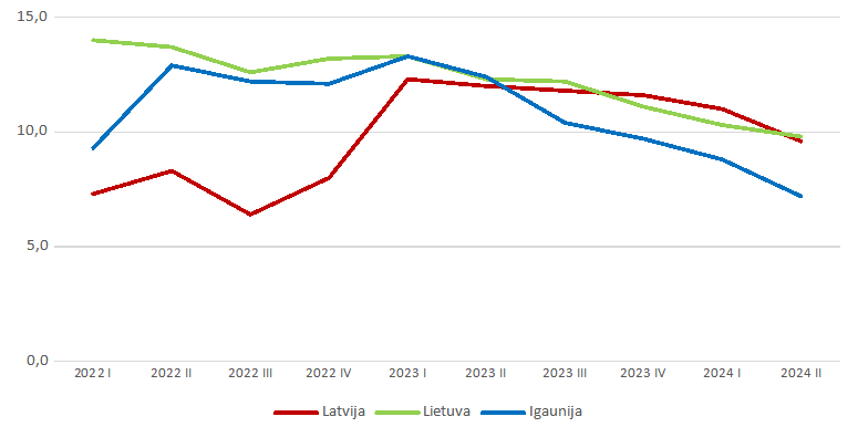Igaunijā 2024. gada 2. ceturksnī, salīdzinot ar 2023. gada 2. ceturksni, vidējā darba samaksa pirms nodokļu nomaksas pieauga par 7,2 %. Lietuvā pieaugums bija visaugstākais – 9,8 %, bet Latvijā nedaudz zemāks – 9,6 %.