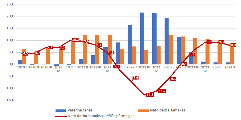 Vidējā neto darba samaksa (aprēķināta, izmantojot darba vietā piemērojamos darba nodokļus) bija 1 213 eiro jeb 72,6 % no bruto algas, un gada laikā tā pieauga par 8,9 %, apsteidzot patēriņa cenu kāpumu. Reālais neto algas pieaugums, ņemot vērā inflāciju, bija 8,0 %.