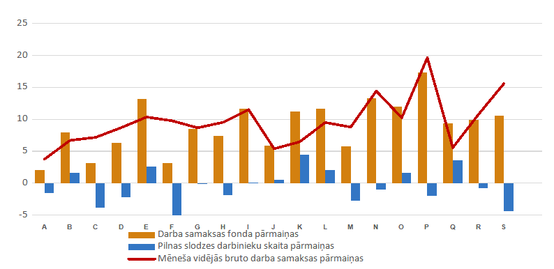 Gada laikā vidējā darba samaksa visstraujāk pieauga izglītības nozarē – par 19,6 %, būtiski ietekmējot gada pieauguma tempu sabiedriskajā sektorā. Vidējais atalgojums strauji auga arī citu pakalpojumu nozarē (ietver sabiedrisko, politisko un citu organizāciju darbību, individuālās lietošanas priekšmetu un mājsaimniecības piederumu remontu, ķīmisko tīrītavu, frizieru, skaistumkopšanas, apbedīšanas un citus pakalpojumus) – par 15,6 %, administratīvo un apkalpojošo dienestu darbības nozarē – par 14,4 %, izmitināšanas un ēdināšanas pakalpojumu nozarē – par 11,5 %.
